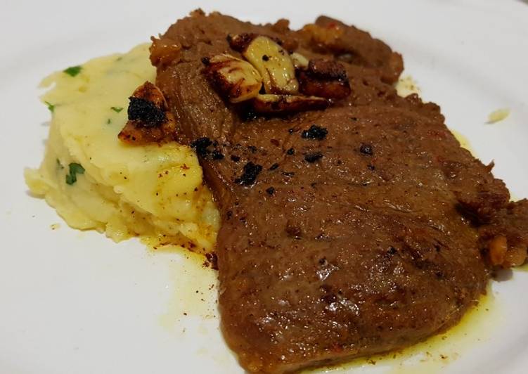 - Frying the beef steaks : o.oil in the pan, one steak and garlic 2 min for each side then add the butter, make sure it is cooked perfectly.. in plate mashed potatoes and one steak.. 👌👌.